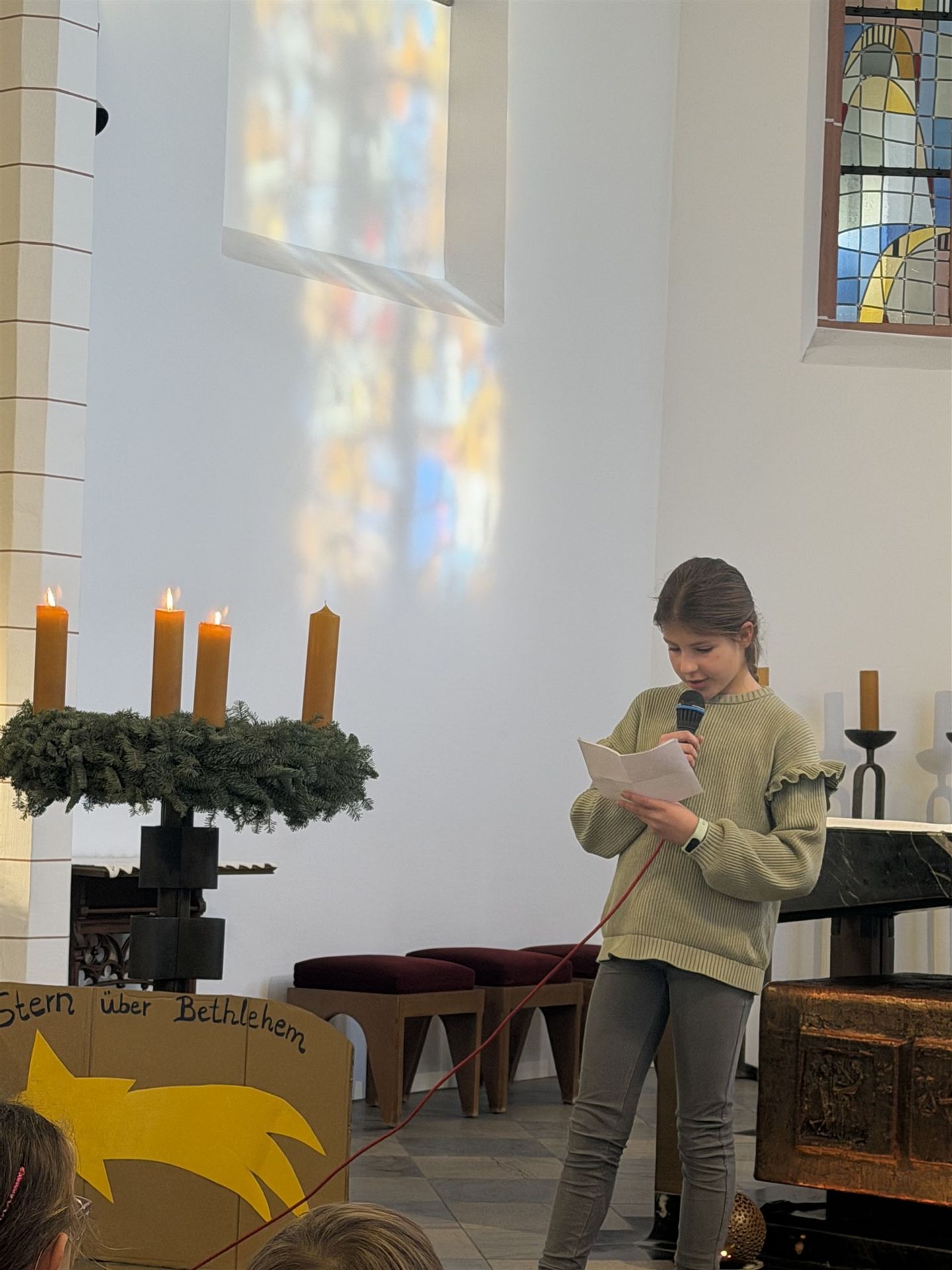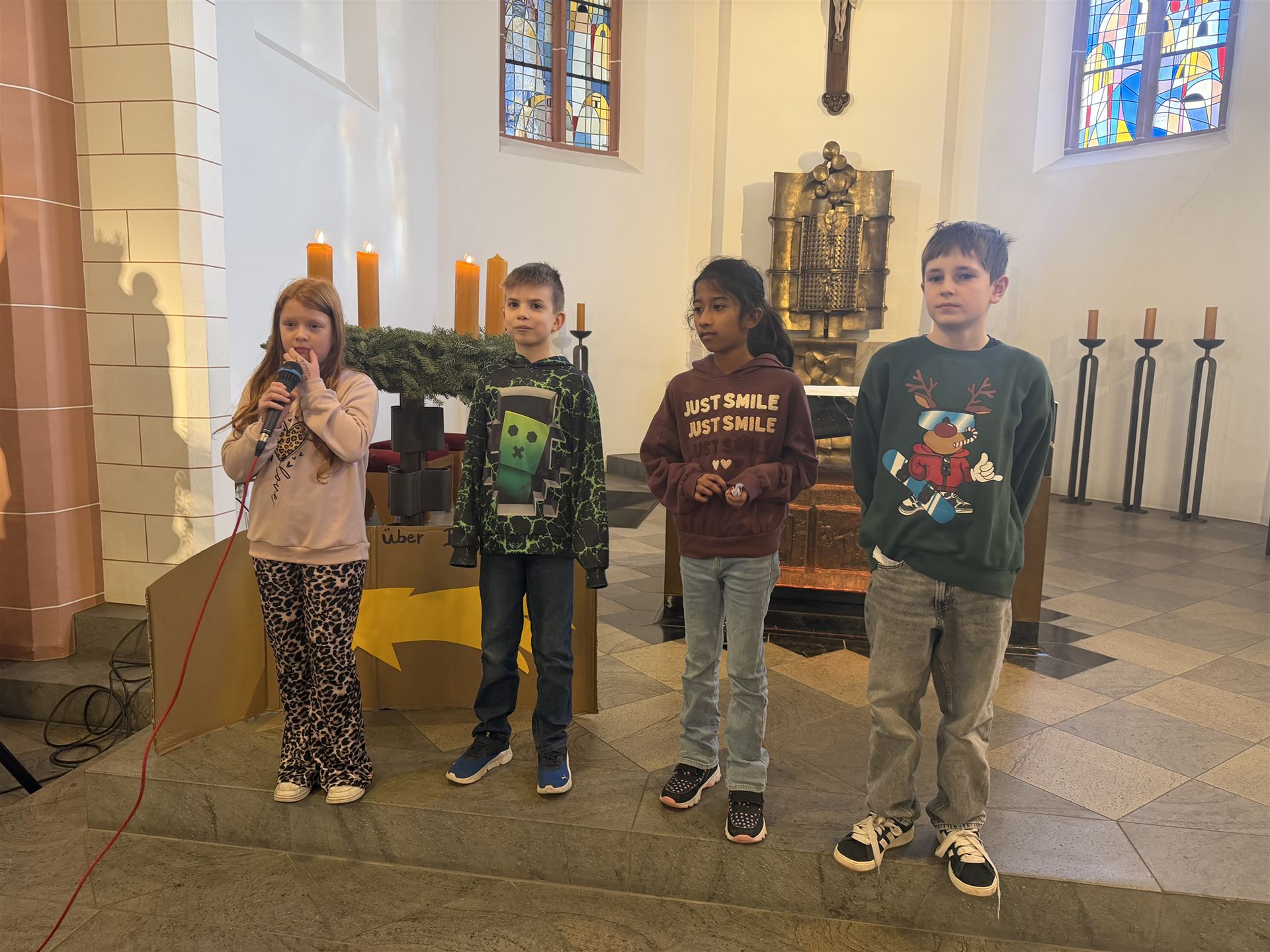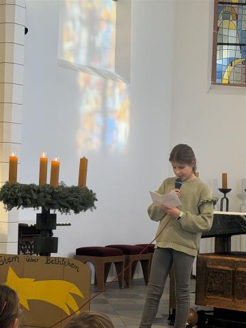 Zunächst nahmen die Klassen 1 und 3 am Gottesdienst teil. Mit Gebeten, Textbeiträgen und Liedern gestalteten die Kinder die Feier auf eindrucksvolle und altersgerechte Weise. Währenddessen sorgte die Klasse 3a mit einem Gesangsbeitrag von Jule Türk für eine musikalische Überbrückung, bis die Klassen 2 und 4 in der Kirche eintrafen und den Gottesdienst fortsetzten.