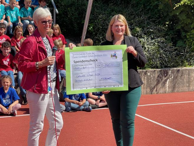 Die Kinder der PGS-Dernbach haben im Rahmen ihres Spendenlaufes, einen Betrag von 14.000,- Euro als Unterstützung an den Verein "Wäller helfen e.V." übergeben.